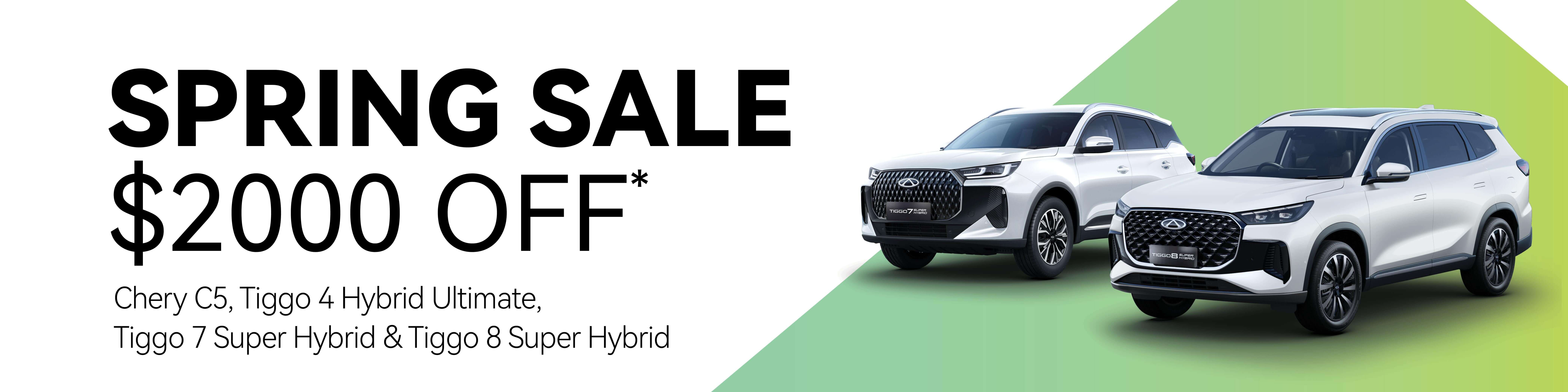 Filter by All Tiggo 4 Hybrid Tiggo 7 Super Hybrid Tiggo 8 Super Hybrid Tiggo 9 Super Hybrid Chery C5 Tiggo 4 Tiggo 7 Tiggo 8 Pro Max Offer ends | 31 October 2025 Tiggo 4 Hybrid Ultimate Driveaway from $34,990 Spring Sale Spring Sale Get $2,000 off* until 31st October. View car details Price excludes premium paint. In addition to Urban :Synthetic Leather Seats360 Around View Monitor6-Way Power Driver’s SeatHeated Front SeatsPremium Steering WheelColour Selectable Ambient Lighting6 Speaker Sound System15W Wireless Charger*Powered Sunroof with SunshadePower Folding Outside MirrorsTemporary Spare Wheel Book a test drive Discover Tiggo 4 Hybrid View disclaimers Offer ends | 31 October 2025 Tiggo 7 Super Hybrid Urban Driveaway from $39,990 Spring Sale Spring Sale Get $2,000 off* until 31st October. View car details Included features:18-inch Alloy WheelsReversing Camera8 AirbagsTPMS (Tyre Pressure Monitoring System) with DisplaySynthetic Leather SeatsAcoustic Glass WindscreenIntelligent Voice Command (Hello Chery)6 Speaker Sound System (4x Speakers, 2x Tweeters)12.3" LCD Driver Instrument Cluster12.3" LCD Infotainment TouchscreenApple Carplay & Android Auto (Wired + Wireless)6-Way Power Adjustable Driver’s SeatLED Daytime Running Lights (DRLs)LED Taillights and Headlights (Projector Type) Book a test drive Discover Tiggo 7 Super Hybrid View disclaimers Offer ends | 31 October 2025 Tiggo 7 Super Hybrid Ultimate Driveaway from $43,990 Spring Sale Spring Sale Get $2,000 off* until 31st October. View car details In addition to Urban:Panoramic Sunroof (Slide & Tilt Function) with Powered SunshadeColour Selectable Ambient LightingHeated and Ventilated Front SeatsDriver Seat with Memory Function8 Speaker SONY™ Sound System (4x Speakers, 4x Tweeters)50W Wireless Charger*Puddle LightsPrivacy Glass (Rear Doors & Tailgate)360° Around View Monitor Book a test drive Discover Tiggo 7 Super Hybrid View disclaimers Offer ends | 31 October 2025 Tiggo 8 Super Hybrid Urban Driveaway from $45,990 Spring Sale Spring Sale Get $2,000 off* until 31st October. View car details Included features:19-inch alloy wheels360° Around View MonitorSynthetic Leather Seats50W Wireless Charger*Colour Selectable Ambient LightIntelligent Voice Command (Hello Chery)10 Speaker Sound System (4x Speakers, 4x Tweeters, 1x Centre Speaker, 1x Subwoofer)10.25" LCD Driver Instrument Cluster15.6" LCD Infotainment TouchscreenAcoustic Glass windscreenPuddle Lights9 airbagsLED Daytime Running Lights (DRLs)LED Taillights and Headlights (projector type) with dynamic turn signals6-Way Powered Driver's Seat Book a test drive Discover Tiggo 8 Super Hybrid View disclaimers Offer ends | 31 October 2025 Tiggo 8 Super Hybrid Ultimate Driveaway from $49,990 Spring Sale Spring Sale Get $2,000 off* until 31st October. View car details In addition to Urban:Heated and ventilated front seatsDriver Headrest Speakers (x2)Head Up Display (HUD)Panoramic Sunroof (slide & tilt function) with powered sunshadePrivacy Glass (Rear Doors & Tailgate)6-Way Powered Driver’s Seat with massage functionIlluminated Scuff Plates (front) Book a test drive Discover Tiggo 8 Super Hybrid View disclaimers Offer ends | 30 November 2025 Tiggo 9 Super Hybrid Ultimate AWD Driveaway from Pre-order Bonus Pre-order Bonus Double Your DepositFrom Oct 7th to Nov 30th, pre-orders for the new Tiggo 9 Super Hybrid are eligible for a deposit match in $500 increments, up to a maximum of $2,000. View car details Include features:Acoustic Glass (windscreen and front door)Automatic Parking Assist (APA)360-degree surround view camera6-Way Power front seat’s (with Thigh Support Extension)Heated and ventilated leather front and rear (outboard) seats***Massage Function for front seatsPremium heated steering wheel10.25-inch driver instrument cluster15.6-inch infotainment touchscreen14 Speaker Sony Sound System including 2 speakers in driver’s seat headrestIn-built GPS NavigationHead Up Display (HUD)Apple CarPlay and Android Auto (wired + wireless)50W* wireless phone chargerIntelligent Voice Command (Hello Chery)Colour Selectable Ambient LightingPuddle lightsPanoramic Sunroof (slide & tilt function) with powered sunshadePower TailgateLED Daytime Running Lights (DRLs)LED Headlights (Projector type) and taillights20-inch alloy wheels Pre-order now Discover Tiggo 9 Super Hybrid View disclaimers Offer ends | 31 October 2025 Chery C5 Urban Driveaway from $29,990 Spring Sale Spring Sale Get $2,000 off* until 31st October. View car details Included features:17" alloy wheelsCloth SeatsLED HeadlightsDual 10.25" Infotainment & vehicle displayApple Carplay™[S2] & Android™[S2] Auto (Wired & Wireless)Proximity Key with Push Button Start16 Chery smart driver assistance systems[S1]6-Way Power Driver's Seat Book a test drive Discover Chery C5 View disclaimers Offer ends | 31 October 2025 Chery C5 Ultimate Driveaway from $34,990 Spring Sale Spring Sale Get $2,000 off* until 31st October. View car details In addition on Urban: 18" alloy wheelsSynthetic Leather SeatsPower TailgatePower Sunroof with Retractable Sunshade360° Around View MonitorHeated Front SeatsRed Brake CallipersDual Zone Airconditioning8 Speaker SONY[S4] Sound System50W Wireless device fast charger[S3]Multi Colour Ambient Interior Lighting Book a test drive Discover Chery C5 View disclaimers Offer ends | 30 November 2025 MY26 Tiggo 4 - Urban Driveaway from $23,990 #1 BEST SELLING SMALL SUV #1 BEST SELLING SMALL SUV $88 per week[F6] | 9.88% P.A Comparison Rate[F6] | Min. 15% Deposit | 60 Month TermGFV[F2] of $6,900 and annual 15,000 km allowance. View car details Included features:17" Alloy WheelsAuto Locking (Walk away)7 AirbagsChery ADAS systemDual 10.25" Infotainment DisplayApple Carplay & Android Auto (Wired + Wireless)Rain Sensing Front Wipers Book a test drive Discover Tiggo 4 View disclaimers Offer ends | 30 November 2025 Tiggo 7 Driveaway from $29,990 Special Offer Special Offer $108 per week[F7] | 9.88% P.A Comparison Rate[F7] | Min.
