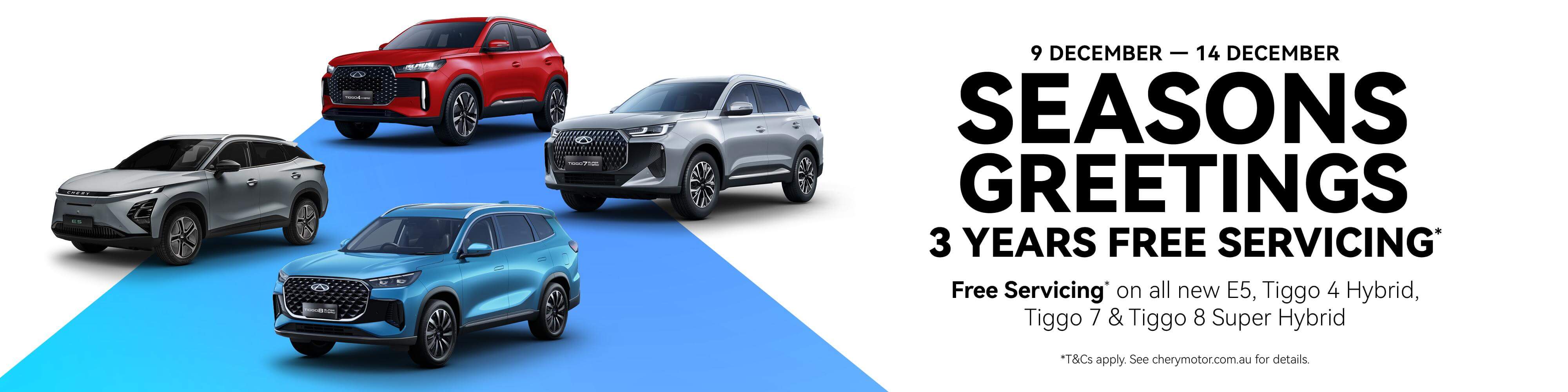 Filter by All Tiggo 4 Hybrid Tiggo 7 Super Hybrid Tiggo 8 Super Hybrid Chery E5 Tiggo 9 Super Hybrid Chery C5 Offer ends | 14 December 2025 Tiggo 4 Hybrid Urban Driveaway from $29,990 Seasons Greetings Seasons Greetings Get 3 years of free servicing*. View car details Price excludes premium paint. Book a test drive Discover Tiggo 4 Hybrid View disclaimers Offer ends | 14 December 2025 Tiggo 4 Hybrid Ultimate Driveaway from $32,990 Special Offer Special Offer Was $34,990, now from $32,990.Plus 3 years free servicing from 9-14th December 2025. View car details Price excludes premium paint. In addition to Urban :Synthetic Leather Seats360 Around View Monitor6-Way Power Driver’s SeatHeated Front SeatsPremium Steering WheelColour Selectable Ambient Lighting6 Speaker Sound System15W Wireless Charger*Powered Sunroof with SunshadePower Folding Outside MirrorsTemporary Spare Wheel Book a test drive Discover Tiggo 4 Hybrid View disclaimers Offer ends | 14 December 2025 Tiggo 7 Super Hybrid Urban Driveaway from $39,990 Seasons Greetings Seasons Greetings Get $2,000 off#, only available until 31 December 2025.Plus 3 years free servicing* from 9-14th December 2025. View car details Included features:18-inch Alloy WheelsReversing Camera8 AirbagsTPMS (Tyre Pressure Monitoring System) with DisplaySynthetic Leather SeatsAcoustic Glass WindscreenIntelligent Voice Command (Hello Chery)6 Speaker Sound System (4x Speakers, 2x Tweeters)12.3" LCD Driver Instrument Cluster12.3" LCD Infotainment TouchscreenApple Carplay & Android Auto (Wired + Wireless)6-Way Power Adjustable Driver’s SeatLED Daytime Running Lights (DRLs)LED Taillights and Headlights (Projector Type) Book a test drive Discover Tiggo 7 Super Hybrid View disclaimers Offer ends | 14 December 2025 Tiggo 7 Super Hybrid Ultimate Driveaway from $43,990 Seasons Greetings Seasons Greetings Get $2,000 off#, only available until 31 December 2025.Plus 3 years free servicing* from 9-14th December 2025. View car details In addition to Urban:Panoramic Sunroof (Slide & Tilt Function) with Powered SunshadeColour Selectable Ambient LightingHeated and Ventilated Front SeatsDriver Seat with Memory Function8 Speaker SONY™ Sound System (4x Speakers, 4x Tweeters)50W Wireless Charger*Puddle LightsPrivacy Glass (Rear Doors & Tailgate)360° Around View Monitor Book a test drive Discover Tiggo 7 Super Hybrid View disclaimers Offer ends | 14 December 2025 Tiggo 8 Super Hybrid Urban Driveaway from $45,990 Seasons Greetings Seasons Greetings Get $2,000 off#, only available until 31 December 2025.Plus 3 years free servicing* from 9-14th December 2025. View car details Included features:19-inch alloy wheels360° Around View MonitorSynthetic Leather Seats50W Wireless Charger*Colour Selectable Ambient LightIntelligent Voice Command (Hello Chery)10 Speaker Sound System (4x Speakers, 4x Tweeters, 1x Centre Speaker, 1x Subwoofer)10.25" LCD Driver Instrument Cluster15.6" LCD Infotainment TouchscreenAcoustic Glass windscreenPuddle Lights9 airbagsLED Daytime Running Lights (DRLs)LED Taillights and Headlights (projector type) with dynamic turn signals6-Way Powered Driver's Seat Book a test drive Discover Tiggo 8 Super Hybrid View disclaimers Offer ends | 14 December 2025 Tiggo 8 Super Hybrid Ultimate Driveaway from $49,990 Seasons Greetings Seasons Greetings Get $2,000 off#, only available until 31 December 2025.Plus 3 years free servicing* from 9-14th December 2025. View car details In addition to Urban:Heated and ventilated front seatsDriver Headrest Speakers (x2)Head Up Display (HUD)Panoramic Sunroof (slide & tilt function) with powered sunshadePrivacy Glass (Rear Doors & Tailgate)6-Way Powered Driver’s Seat with massage functionIlluminated Scuff Plates (front) Book a test drive Discover Tiggo 8 Super Hybrid View disclaimers Offer ends | 14 December 2025 Chery E5 Urban (All-Electric) Driveaway from $38,990 Seasons Greetings Seasons Greetings 4.88% P.A. Comparison Rate | No Minimum Deposit | 36-60 Month Term with no balloon payment#Plus 3 years free servicing* from 9-14th December 2025. View car details Included features:18-inch alloy wheelsFull-sized spare wheel12.3-inch touchscreen infotainment systemWireless Apple CarPlay and Android Auto6-speaker sound systemFabric seats with leatherette bolster Book a test drive Discover Chery E5 View disclaimers Offer ends | 14 December 2025 Chery E5 Ultimate (All-Electric) Driveaway from $42,990 Seasons Greetings Seasons Greetings 4.88% P.A. Comparison Rate | No Minimum Deposit | 36-60 Month Term with no balloon payment#Plus 3 years free servicing* from 9-14th December 2025. View car details In addition to Urban:Power tailgatePower sunroofAmbient lightingBlack leatherette upholsteryHeated front seats & rear seatsHeated leatherette-wrapped steering wheel50W wireless phone charger8 Speaker SONY[S4] Sound SystemSequential Rear Turn Signals Book a test drive Discover Chery E5 View disclaimers Offer ends | 31 December 2025 Tiggo 9 Super Hybrid Ultimate AWD Driveaway from Special Offer Special Offer 1.88% P.A. Comparison Rate | No Minimum Deposit | 36-60 Month Term with no final balloon payment* View car details Include features:Acoustic Glass (windscreen and front door)Automatic Parking Assist (APA)360-degree surround view camera6-Way Power front seat’s (with Thigh Support Extension)Heated and ventilated leather front and rear (outboard) seats***Massage Function for front seatsPremium heated steering wheel10.25-inch driver instrument cluster15.6-inch infotainment touchscreen14 Speaker Sony Sound System including 2 speakers in driver’s seat headrestIn-built GPS NavigationHead Up Display (HUD)Apple CarPlay and Android Auto (wired + wireless)50W* wireless phone chargerIntelligent Voice Command (Hello Chery)Colour Selectable Ambient LightingPuddle lightsPanoramic Sunroof (slide & tilt function) with powered sunshadePower TailgateLED Daytime Running Lights (DRLs)LED Headlights (Projector type) and taillights20-inch alloy wheels Book a test dr